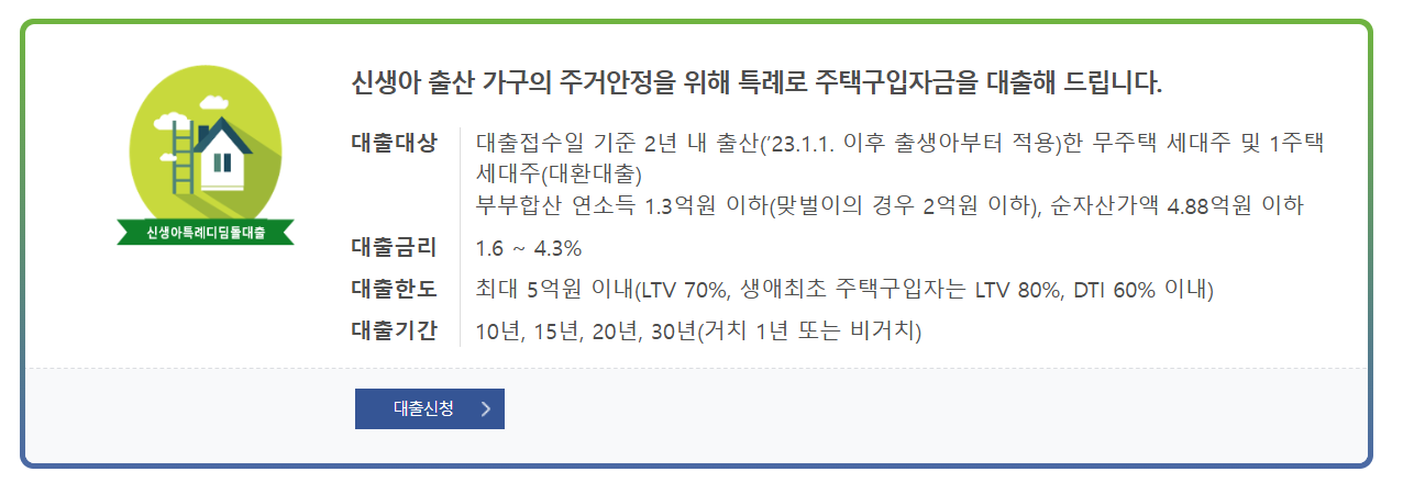 - 2023년 1월 1일 이후 출생아부터 적용되며, 입양의 경우 대출신청일 기준 입양아의 나이는 만 2세 미만이어야 합니다.